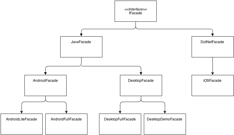 To avoid having duplicated code in each facade implementation, I set up additional projects that contain abstract implementations. For example, a Java-project that contains an abstract JavaFacade class and implements all the code that’s common for each Java-based platform. Which is essentially every platform except iOS. Here is an UML diagram that shows the (almost) complete facade tree: